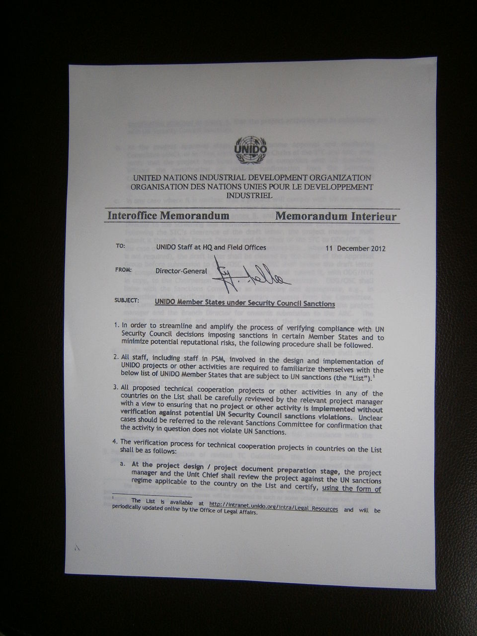 ▲制裁対象国への対応で注意を喚起するユムケラー事務局長のメモランダム(2013年1月21日、撮影)