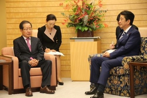 ▲安倍首相より低い椅子に座らされた洪準杓自由韓国党代表(2017年12月14日、東京の首相官邸で、写真・自由韓国党から)
