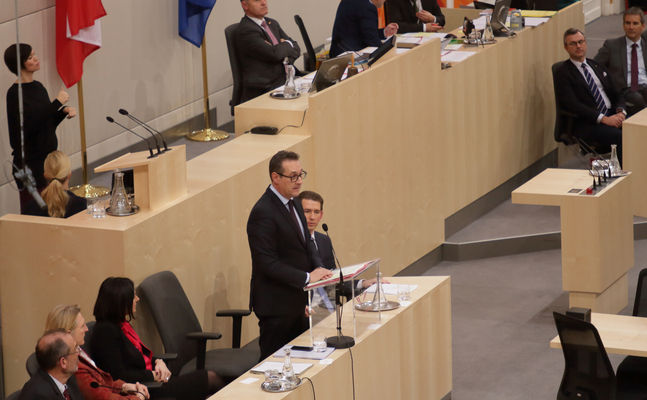 ▲議会で演説をするシュトラーヒェ副首相(自由党党首)=2017年12月20日、自由党公式HPから