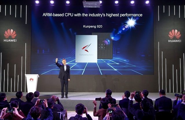 ▲ファーウェイが業界最高性能の7nmプロセスのARMベースCPU「Kunpeng920」を発表(2019年1月9日、中国・深圳の記者会見で、ファーウェイ社公式サイトから)