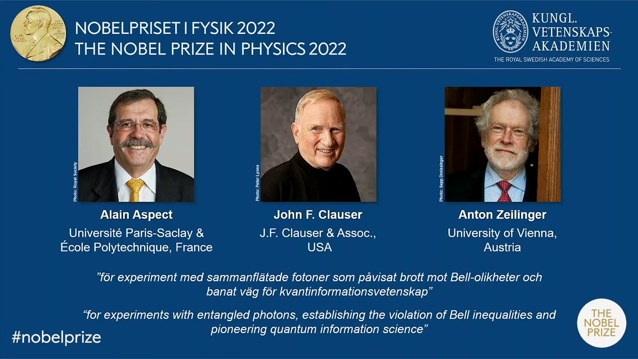 ▲ツァイリンガー教授(右)はじめ2022年のノーベル物理学賞の3人の受賞者(ノーベル賞委員会サイトのスクリーンショットから、2022年10月4日)