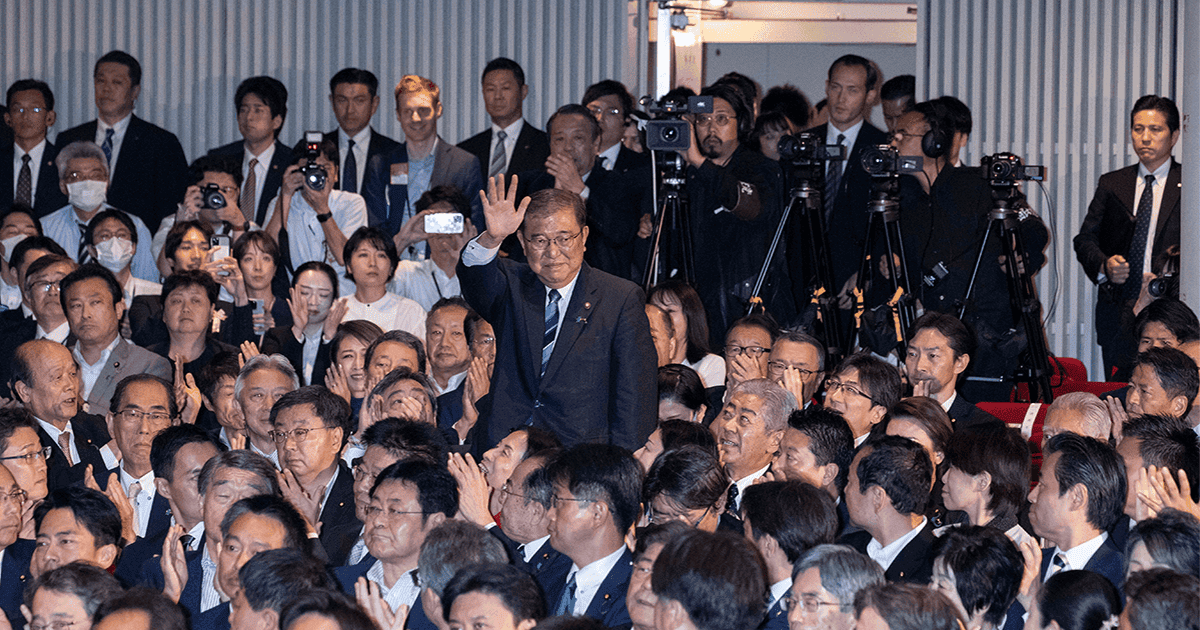 ▲自由民主党総裁選で当選が決まり、祝福の拍手を受ける石破氏